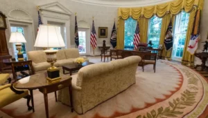While some of the decor remains unchanged, like the gold curtains Trump selected during his first term, other elements have been swapped out. Biden’s blue rug has been replaced by the neutral-toned one from Trump’s prior Oval Office design.